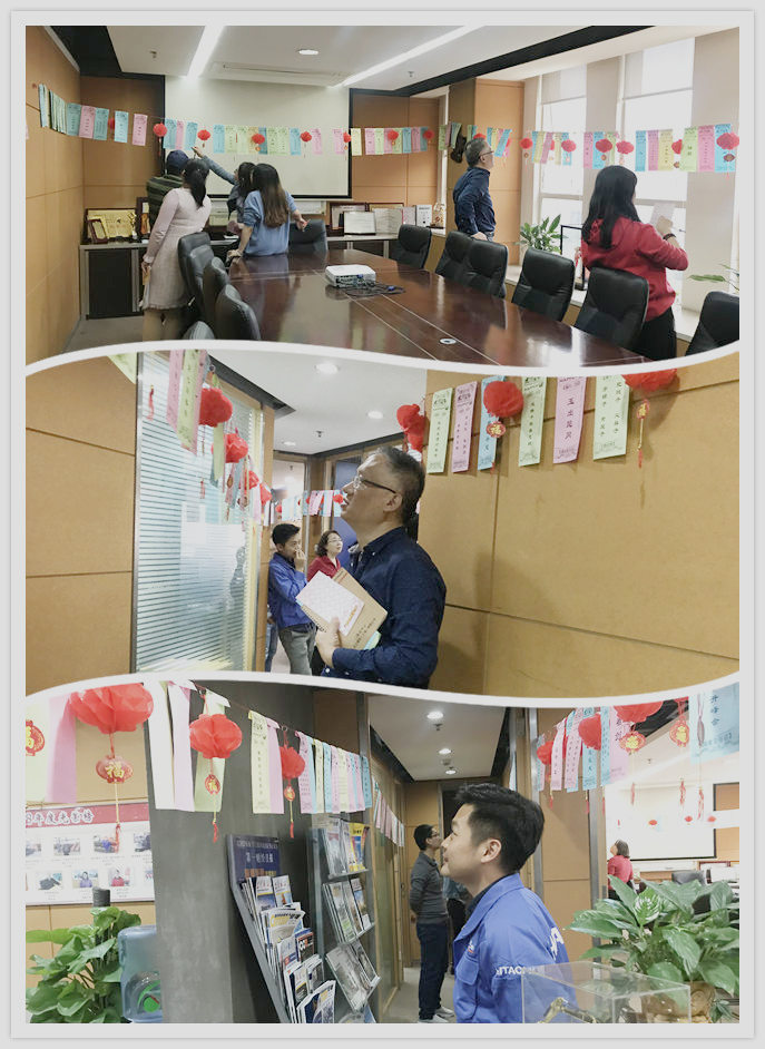總公司前臺(tái)、會(huì)議室、辦公室走廊等掛滿了喜氣洋洋的紅燈籠以及400道彩色燈謎條。來(lái)自美鵬的高手們爭(zhēng)相競(jìng)技,猜謎博弈,現(xiàn)場(chǎng)不時(shí)傳來(lái)陣陣笑語(yǔ)。